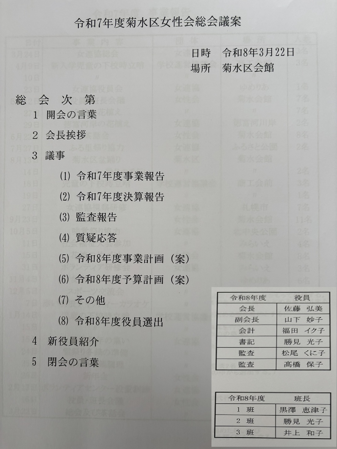 3月22日(日)菊水自治会館において、女性会の令和7年度総会が行われました。会員11名全員が出席し、令和7年度の事業報告や会計決算報告、そして令和8年度の事業計画(案)、会計予算(案)が提示され、すべて承認されました。また、令和8年度の役員も選出され、会議は無事終了しました。会議の後には、食事会が行われ、和やかな雰囲気の中、会員の親睦を深め、閉会しました。